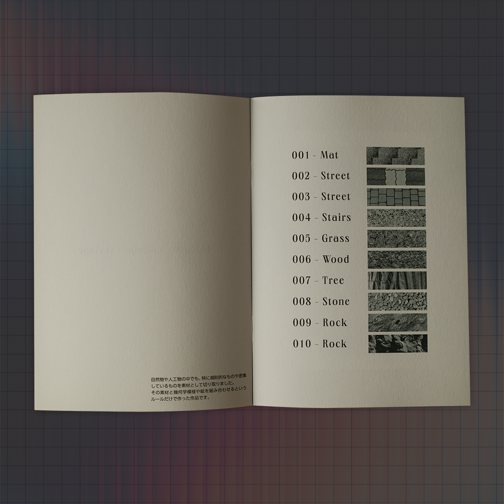 自然物や人工物の中でも、特に規則的なものや密集しているものを素材として切り取りました。その素材と幾何学模様や絵を組み合わせるというルールだけで作った作品をまとめました。